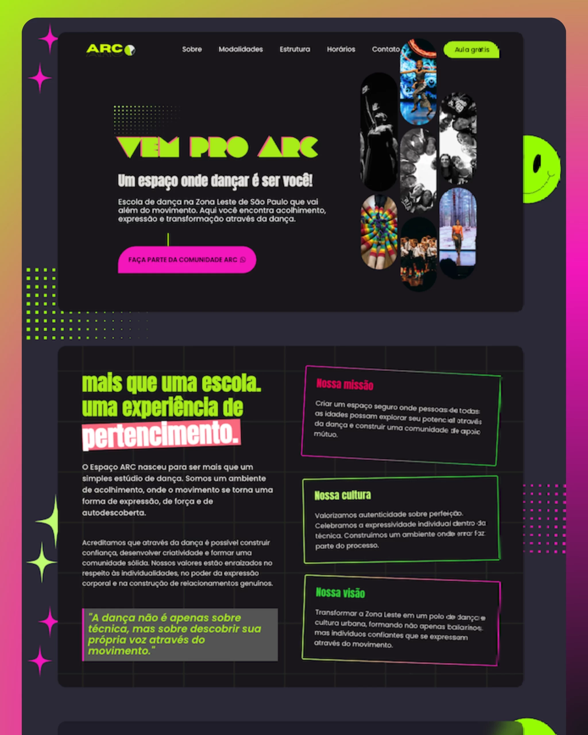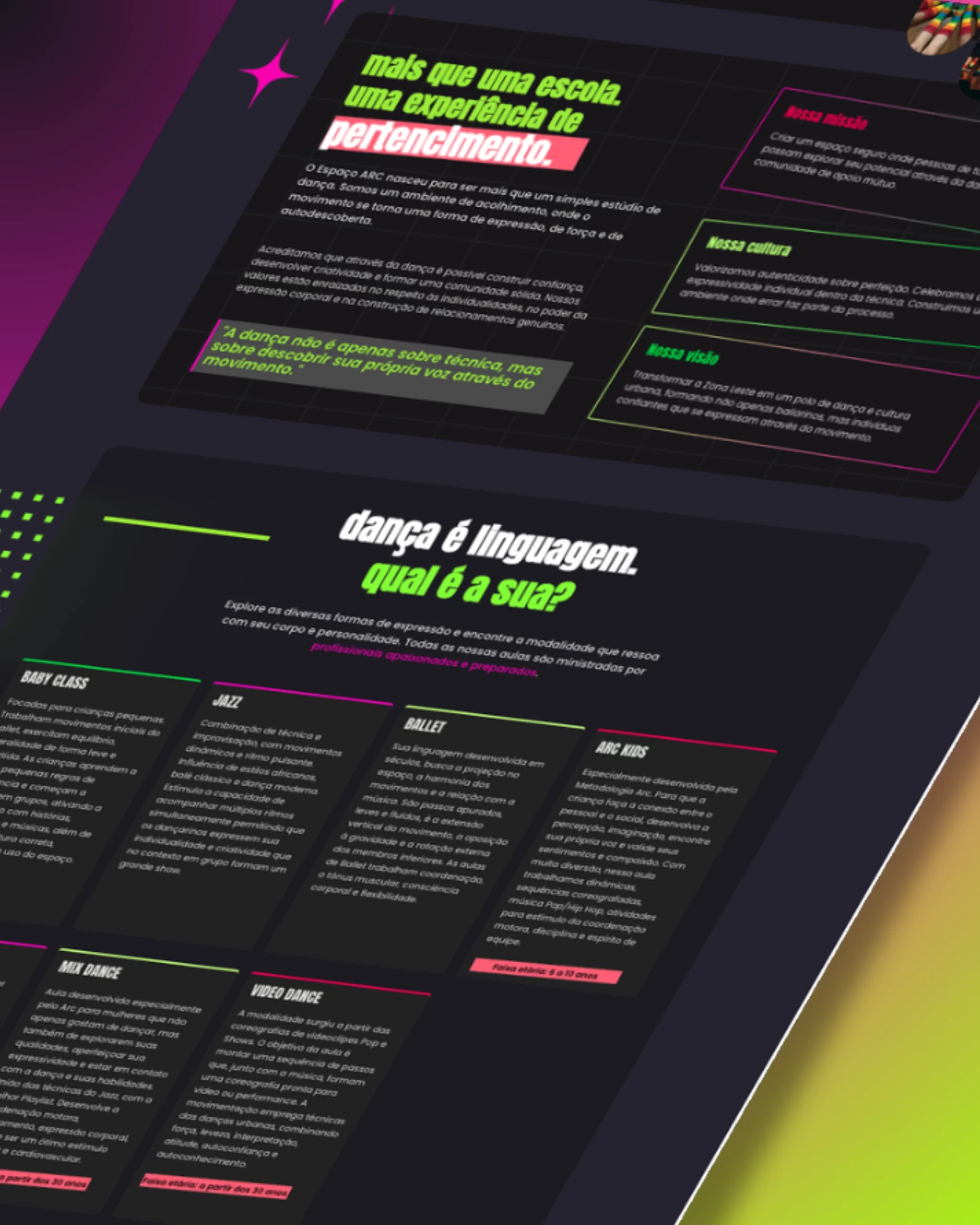 Começamos ouvindo a essência da ARC: uma escola de dança urbana, com muita energia, acolhimento e identidade forte. Nada de estereótipos clássicos: aqui, o protagonismo é das danças como hip hop, jazz funk e baby class — com muita atitude. Criamos um site no formato “one page” com linguagem persuasiva, fluidez visual e fácil leitura no mobile.