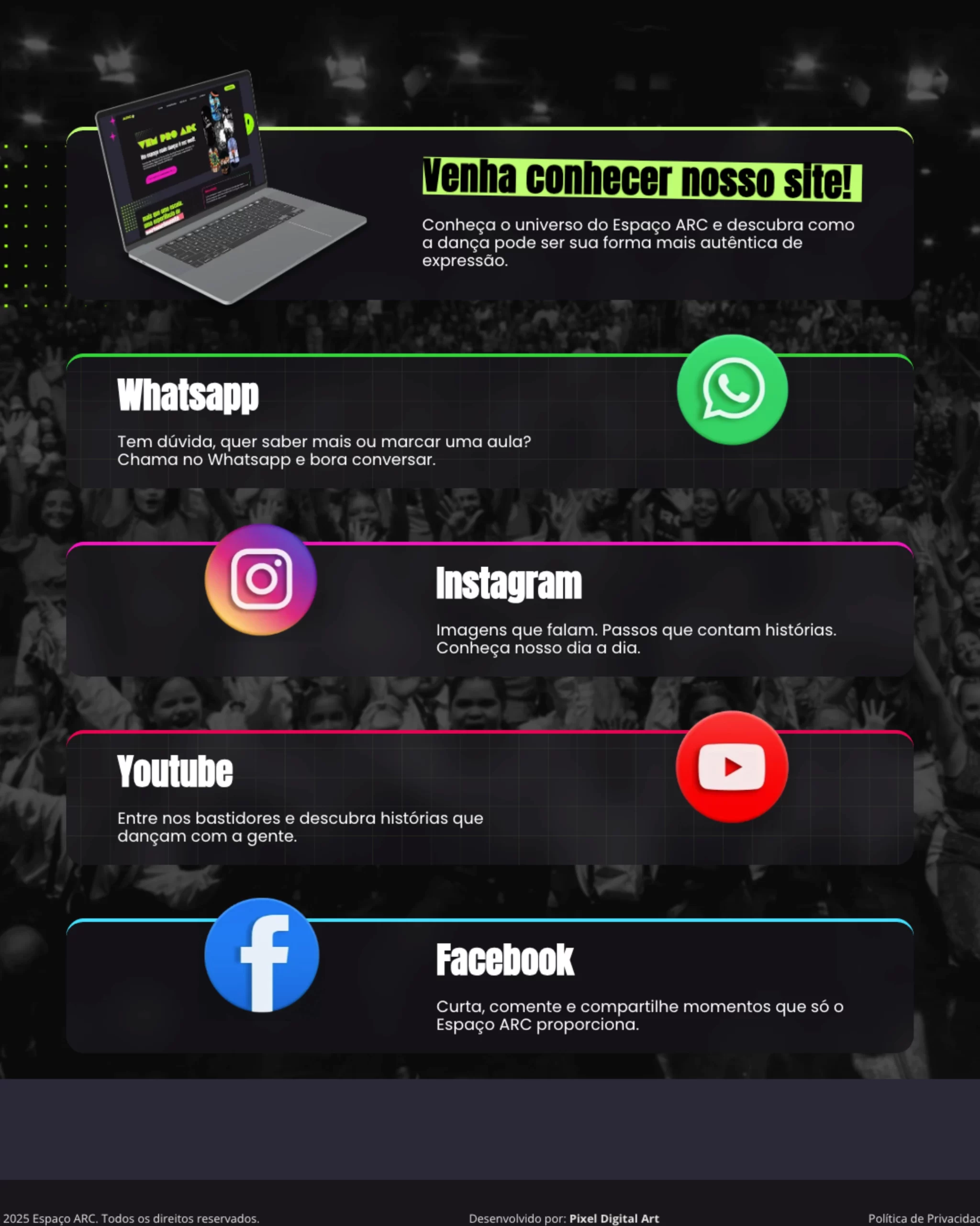 Como complemento, desenvolvemos também uma página de links personalizada, no estilo Linktree, conectando os principais canais da ARC — WhatsApp, Instagram, YouTube e Facebook — com identidade visual própria.